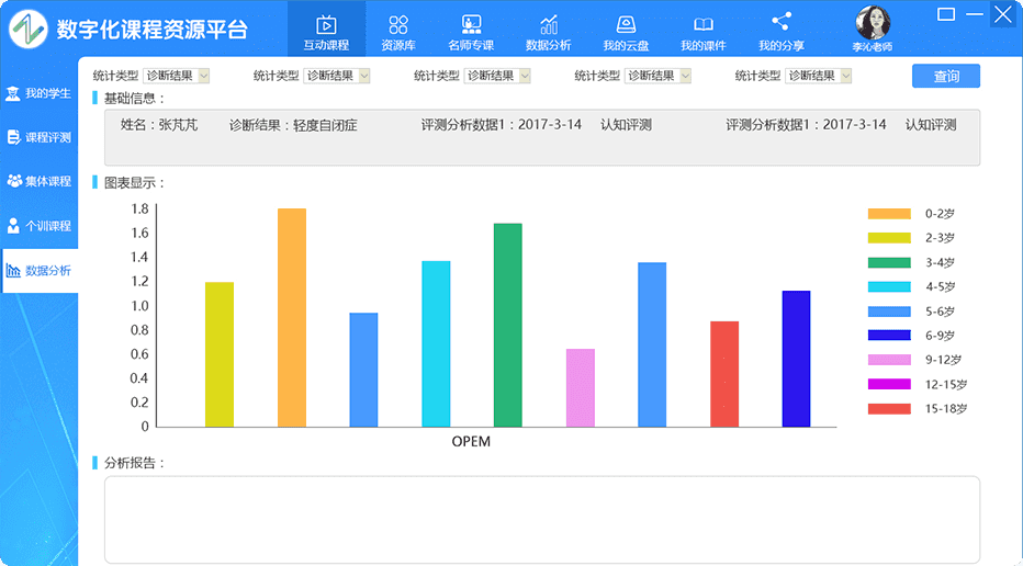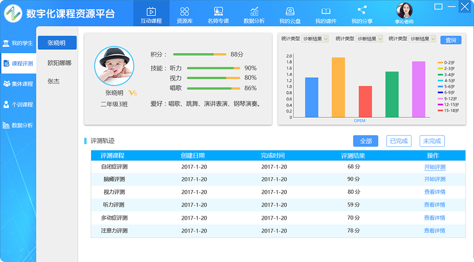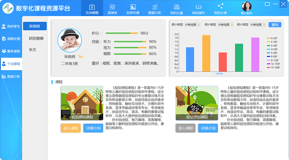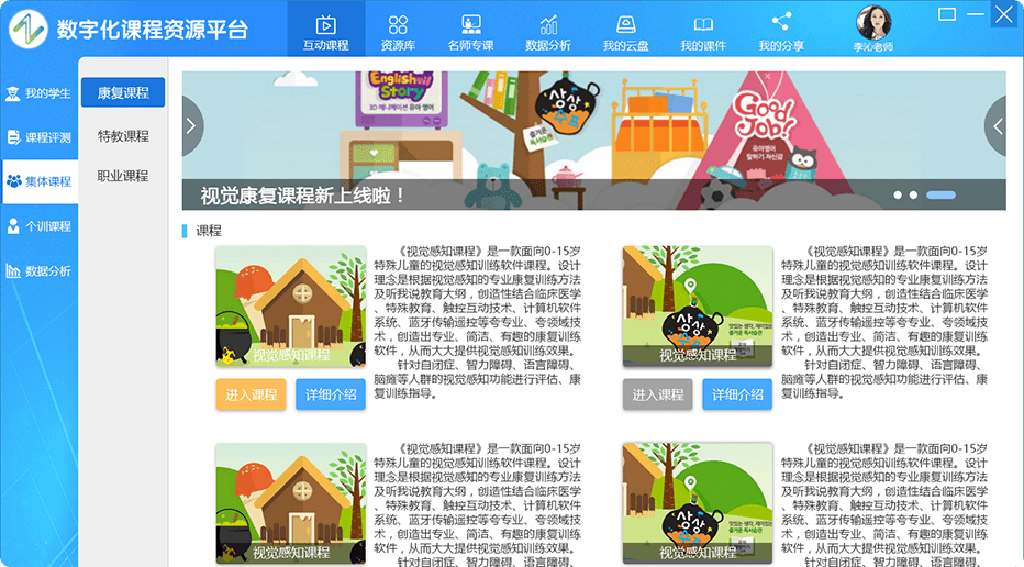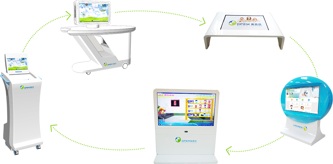 一套针对教育康复领域研发的互动式课 程平台,包含康复课程、特教课程、职业课程等各种不同年龄阶段的训练教学课程系统、 通过大型触控设备、虚拟体感互动等设备,实现人机交互、多人互动,操作简单方便,趣味性强, 使患儿在互动游戏中完成康复和训练任务。